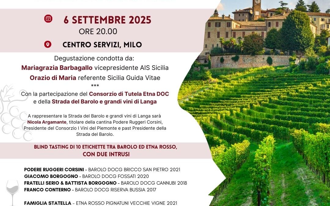Con la partecipazione del Consorzio per la tutela dei vini Etna DOC e della Strada del Barolo e grandi vini di Langa, l’incontro offrirà un viaggio sensoriale tra i versanti lavici del Nerello Mascalese e le colline piemontesi del Nebbiolo.