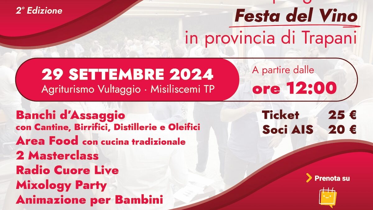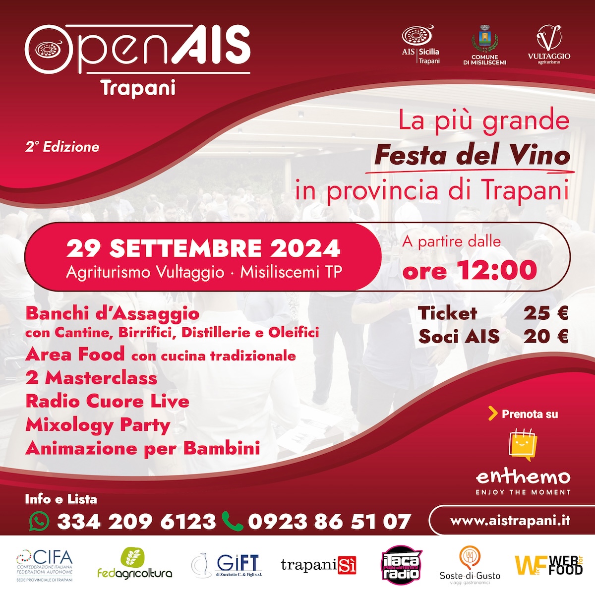 Una festa, la più grande del vino sul territorio, voluta e organizzata dall’Associazione Italiana Sommelier di Trapani. Una festa per tutti e non solo per i soci. Un festa che mette al centro la cultura del buon bere e del buon cibo per far conoscere e apprezzare le grandi produzioni del nostro Paese.